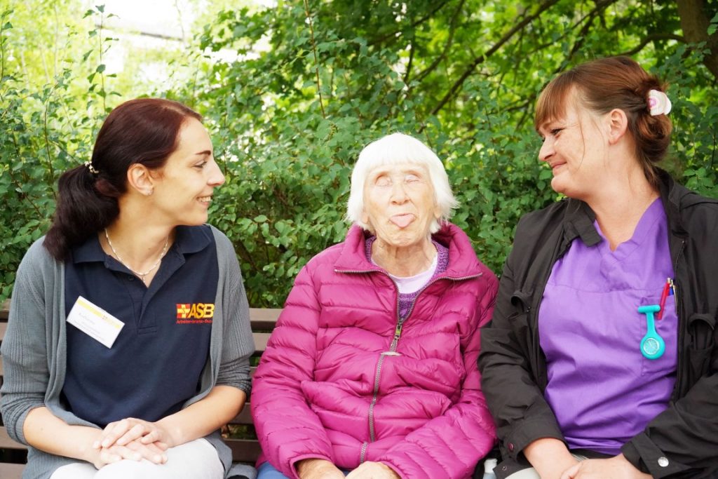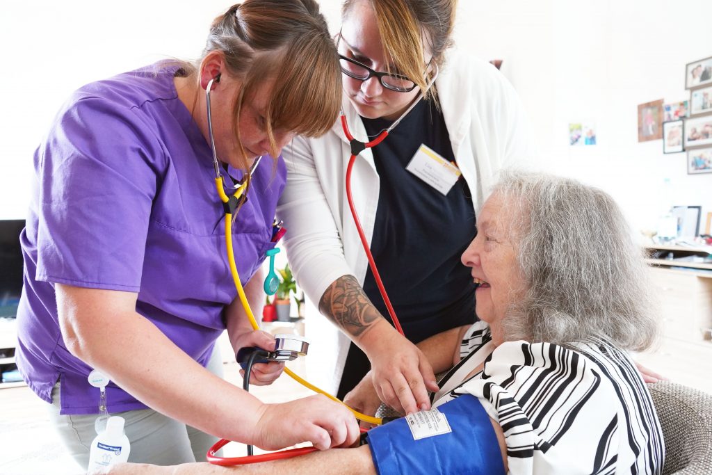 Wir sind bei Sabine Kleinschmidt, einer aufgeweckten 85-jährigen Frau, die gerne mit den Pflegekräften rumscherzt und ihnen die Zunge rausstreckt. Da sie fast blind ist, benötigt sie die Unterstützung vom ASB. Als erstes wird der Puls gemessen. Doch wo ist er? Nach einigem Suchen hat Janine ihn mit Hilfe von Lisa am Handgelenk gefunden. sie schaut auf die Schwestern-Uhr und zählt gedanklich mit. Der Puls kann auf Probleme beim Herzen oder andere Erkrankungen hindeuten. Auch der Pulsrhythmus wird geprüft. Je regelmäßiger der Puls geprüft wird, desto leichter lassen sich Veränderungen erkennen. Die Blutdruckmessung klappt für Janine dagegen auf Anhieb. Zum Abhören nutzt sie ein besonderes Lehr-Stethoskop. Anstelle zweier Ohrbügel hat das Stethoskop vier Ohrbügel, sodass Lisa genau das gleiche wie Janine hört und ihre Werte überprüfen kann. Im Anschluss geht es zu einem kleinen Spaziergang nach draußen. Erst am Tag zuvor hatte Janine ihre Leistungskontrolle in dem Bereich Betreuung erfolgreich gemeistert. Trotzdem bleibt es weiterhin Bestandteil ihrer Ausbildung.
