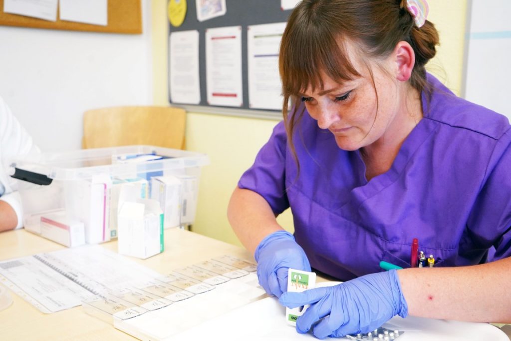 Lisa Mundil und Katharina Ringleb leiten heute Janine Küchler an. Sie sind sogenannte Praxisanleiterinnen. Das heißt, sie haben neben ihrer Kompetenz als Pflegefachkraft in einer zusätzlichen Weiterbildung gelernt, pflegerisches Know-how an Dritte weiterzugeben und sie anzuleiten. Janine hat heute ein komplexes Programm: Sie muss zwei Betreuungsangebote umsetzen, üben, wie man Puls- und Blutdruck misst und Medikamente stellen. So nennt man da Vorbereiten der richtigen Medikation für den richtigen Menschen zu genau der richtigen Zeit.