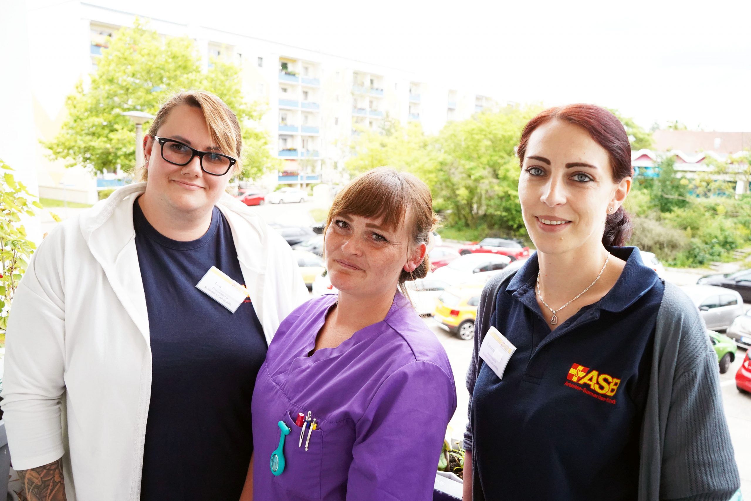Wir sind verabredet in Ludwigsfelde vor den ASB-eigenen seniorengerechten Wohnungen mit den Kolleginnen Lisa Mundil, Katharina Ringleb und Janine Küchler. Janine kam als Quereinsteigerin vor knapp zwei Jahren zum Team unseres Demenzheimes in Ludwigsfelde. Mittlerweile steht sie am Ende ihres ersten Ausbildungsjahres zu Pflegefachkraft. Damit sie später Pflege in allen Variationen kennen, absolvieren unsere Azubis Praxiseinsätze in anderen Einrichtungen wie Krankenhäusern, psychiatrischen Abteilungen, Arztpraxen und unter anderem auch in der ambulanten Pflege. Hier können sie unter Aufsicht und Anleitung von erfahrenen Ausbildern ihr theoretisches Wissen aus der Pflegeschule am praktischen Beispiel vertiefen. Je nach Lehrjahr sind die Aufgaben unterschiedlich komplex.