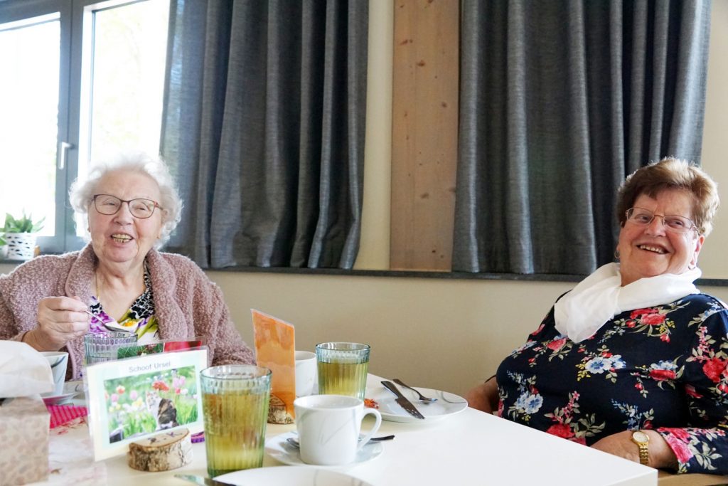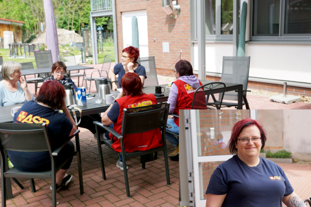 Und langsam trudeln die ersten Gäste der Tagespflege ein. Viele werden aus den umliegenden Dörfern wie Tornow, Teupitz, Münchehofe, Töpchin, Schwerin oder Halbe mit dem Fahrdienst gebracht. Andere kommen in Begleitung der Familie, oder können gar zu Fuß von einer Mitarbeiterin des Zentrums abgeholt werden. So auch wie die 95-jährige Ursel Schoof, die direkt gegenüber auf der anderen Straßenseite wohnt. Die Räume füllen sich mit Lachen, angeregten Gesprächen, hier und da werden Umarmungen ausgetauscht. Alle versammeln sich in einem der Ruheräume in bequemen Sesseln und bekommen dampfenden Kräutertee gereicht. Man wartet noch auf den zweiten Bus mit den anderen Gästen, bis das Frühstück beginnt. Derweil werden Geschichten ausgetauscht über alte gemeinsame Lehrer und Mitschüler, ehemalige Kollegen, die der Mann oder die Cousine von einem anderen Tagesgast waren, welche Baustelle sich wieder verzögert und was der gemeinsame Arzt zu dem einen oder anderen Knie urteilte, und mit welchem Unfug die Kinder damals einen Skandal im Dorf provozierten. Bald möchte man meinen, dass sich gute Freunde Jahrzehnte nicht mehr gesehen hätten und sich nun hier erstmals wieder begegnen. Auch Rosika Austen ist dazu gestoßen. Just als beschlossen wurde, dass das Frühstück nun startet, trudeln die anderen Gäste ein. Etwas enttäuscht, dass sie das Morgentee-Ritual verpasst haben, gesellen sie sich zu den anderen an den Frühstückstisch und versuchen die ebenso verpassten Neuigkeiten aufzuholen. Da aber auch sie selbst wiederum News mitgebracht haben, steigt der Geräuschpegel nochmal deutlich an. Derweil werden Wurst- und Marmeladenbrötchen genüsslich verspeist. Heimlich winkt eine Seniorin einen Pfleger heran. Sie hat morgen Geburtstag und würde gerne für alle Eierlikör in Waffelbechern spendieren. Ob er ihr alles besorgen könne? Das Frühstück neigt sich dem Ende. Während einige Gäste diskutieren, ob sie nachher lieber Rommé oder Doppelkopf spielen wollen, helfen andere mit beim Abräumen und wiederrum andere machen sich bereit für ihren kleinen Tagesausflug.