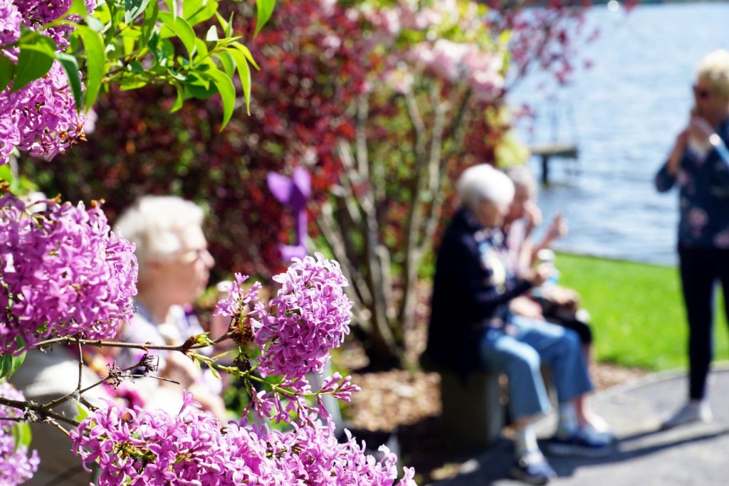 Doch auch für Rosika Austen sind die Grenzen zwischen dem seniorengerechten Wohnen, dem ambulanten Pflegedienst und der Tagespflege fließend. Während Vanessa bereits zur nächsten Nachbarin weitergegangen ist, legt Rosika letzte Hand an ihre Garderobe und Geschmeide an. Das schöne Wetter der vergangenen Tage lockt in der Tagespflege zu einem Ausflug in den chinesischen Garten am Zeuthener See. Was bedeutet es für sie, hier alles beieinander zu haben? „Abwechslung pur. Ich sehe Freunde, alte Bekannte wieder. Das hätte ich Zuhause so nicht mehr gehabt.“ Frau Austen wohnte Zeit ihres Lebens in Märkisch Buchholz und vermisst die kleinste Stadt des Landkreises Dahme-Spreewald, ihr Zuhause und vor allem ihren Garten wirklich sehr. Ein kleiner Trost ist die Lounge für die Mieterinnen der Wohnungen. Wie in einem kleinen Wintergarten mit Ausblick werden die modernen Ohrensessel über und über mit grünem Dickicht gerahmt. Als passionierte Gärtnerin tobt sich Frau Austen nun an diesen Zimmerpflanzen aus. Während in ihrer eigenen Wohnung vor lauter Orchideen kein freier Platz mehr zu finden ist, bietet die Lounge gerne ein Zuhause für eine weitere Monstera oder Grünlilie. Während sich Rosika um ihre grünen Schützlinge kümmert, erwacht die Tagespflege eine Etage tiefer langsam zum Leben.